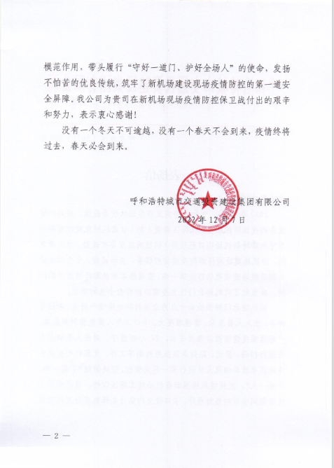 2022年12月7日,呼和浩特市交通投資建設(shè)集團(tuán)有限公司給我司發(fā)來表揚(yáng)信,表揚(yáng)信中充分肯定了我司呼和浩特新機(jī)場項目部在疫情防控工作上作出的努力,展現(xiàn)了我司的社會責(zé)任與擔(dān)當(dāng)。