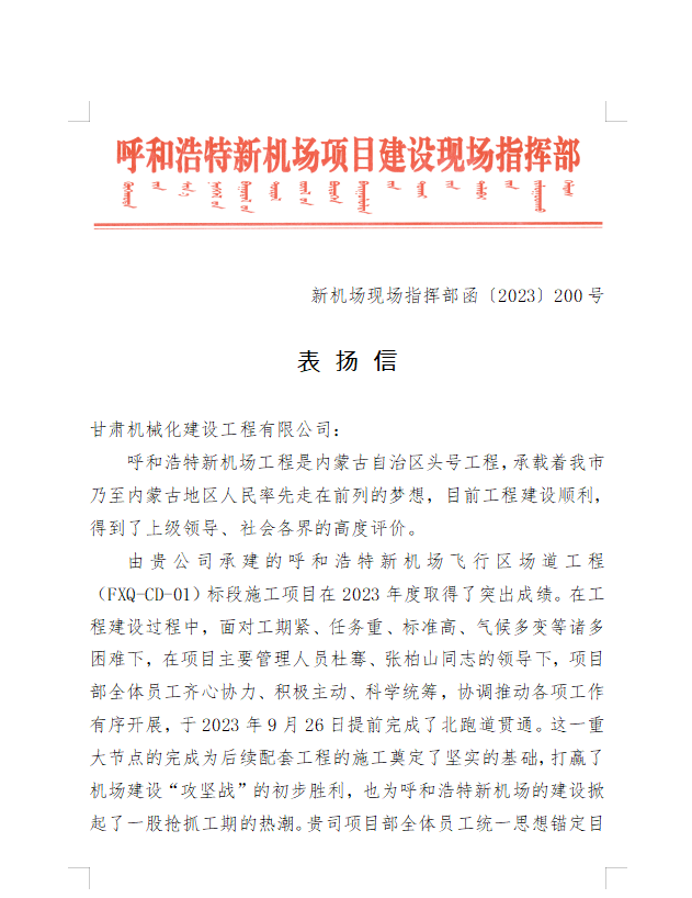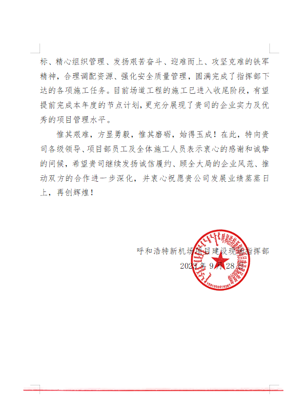 2023年9月28日,呼和浩特新機(jī)場(chǎng)項(xiàng)目建設(shè)現(xiàn)場(chǎng)指揮部給我司發(fā)來(lái)表?yè)P(yáng)信,信中充分肯定了我司在呼和浩特新機(jī)場(chǎng)項(xiàng)目建設(shè)中項(xiàng)目部全體員工統(tǒng)一思想錨定目標(biāo)、精心組織管理、發(fā)揚(yáng)艱苦奮斗、迎難而上、攻堅(jiān)克難的鐵軍精神,合理調(diào)配資源、強(qiáng)化安全質(zhì)量管理,圓滿(mǎn)完成了指揮部下達(dá)的各項(xiàng)施工任務(wù)。