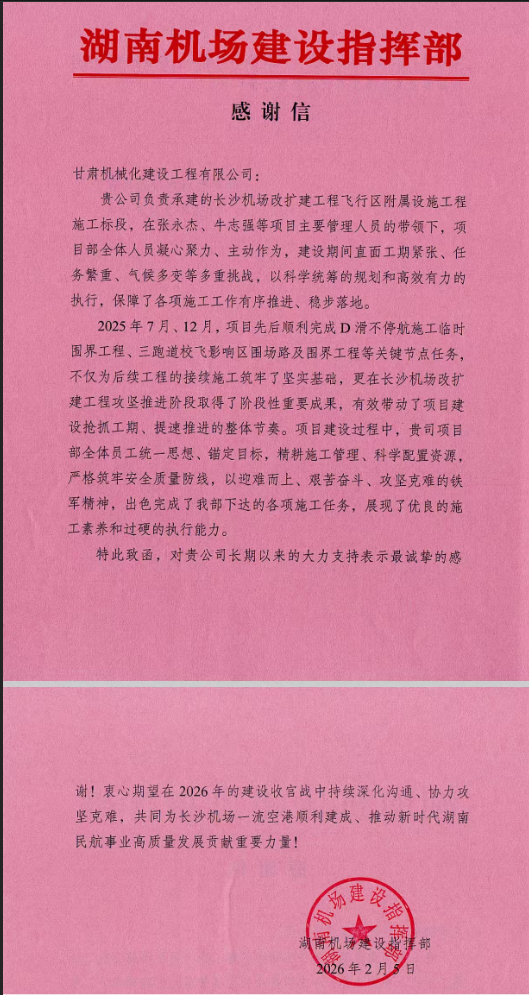 兩封感謝信,既是對項目團隊攻堅克難、實干擔當?shù)某浞挚隙?,更是對我司綜合實力與專業(yè)能力的高度認可。我司將以兩大機場項目為新起點,持續(xù)深化合作、精益求精,以更高標準完成各項工程任務,為民航及基礎設施建設事業(yè)再立新功。
